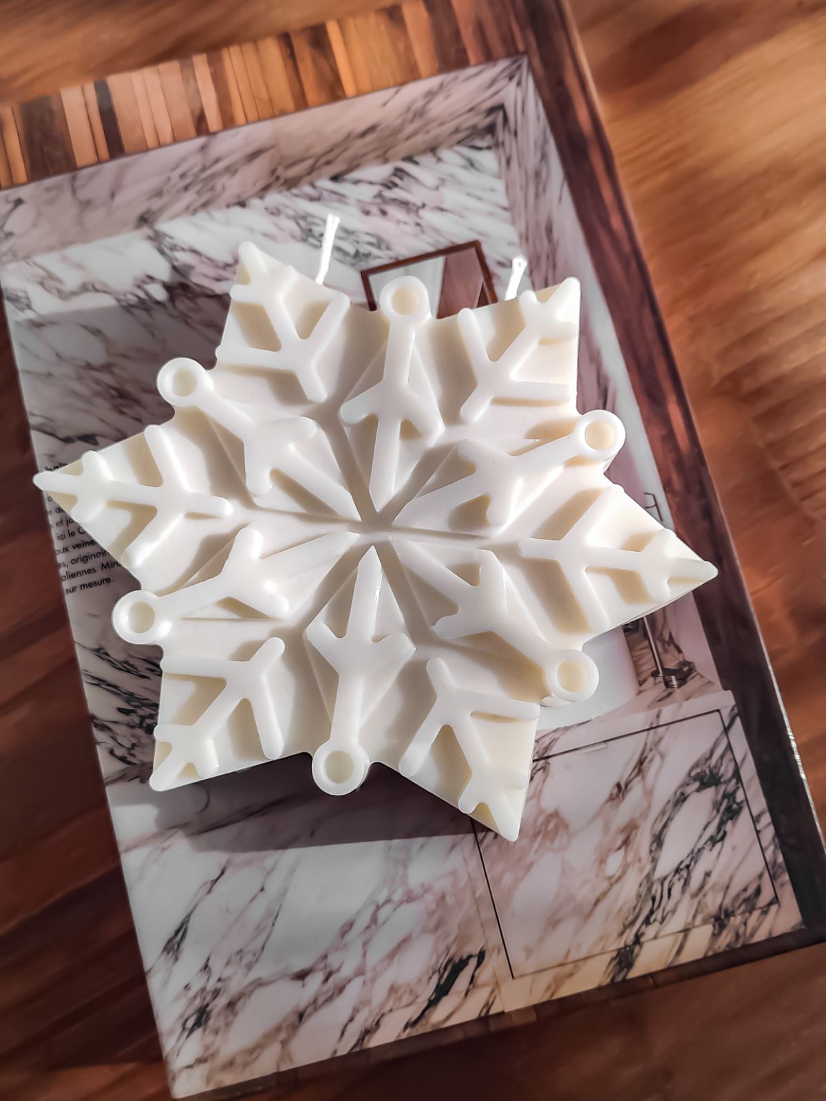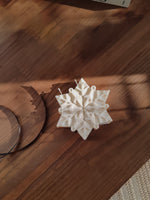 Une pièce parfaite pour les fêtes : une grande bougie qui s'intègre facilement sur une déco de table, une étagère ou dans une composition décorative. Une fois allumée, elle crée une atmosphère apaisante et apporte une touche magique à votre intérieur. Fabriquée à la main dans la ville de Lyon, notre bougie Max, un flocon, est faite avec une cire naturelle de soja.